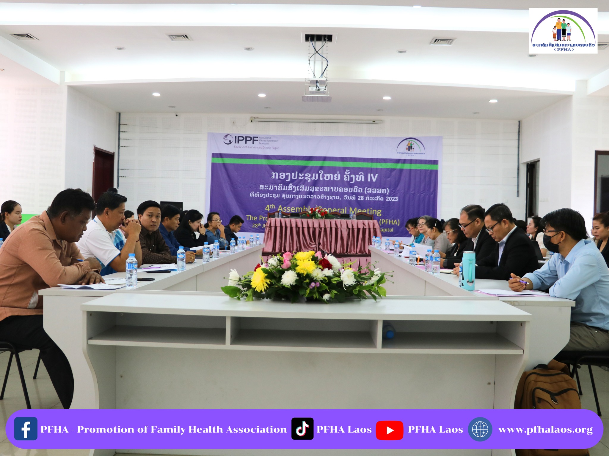 ໃນວັນທີ 28 ກໍລະກົດ 2023 ທີ່ຜ່ານມາ ສະມາຄົມສົ່ງເສີມສຸຂະພາບຄອບຄົວ ໄດ້ຈັດກອງປະຊຸມໃຫຍ່ຄັ້ງທີ IV ຢູ່ທີ່ຫ້ອງປະຊຸມສູນກາງແນວລາວສ້າງຊາດ, ໂດຍການເປັນປະທານ ຂອງທ່ານ ນາງ ດຣ ຈັນສີ ພິມພະຈັນ ປະທານສະມາຄົມສົ່ງເສີມສຸຂະພາບຄອບຄົວ. ພາຍໃນກອງປະຊຸມໄດ້ມີການຮັບຊົມວິດີໂອ ປະຫວັດຄວາມເປັນມາ ແລະ ພາບລວມຂອງ ສສສຄ, ພ້ອມກັນນັ້ນຍັງໄດ້ມີການລາຍງານ ການເຄື່ອໄຫວວຽກງານ, ຜົນໄດ້ຮັບຂອງການເຮັດວຽກໃນໄລຍະຜ່ານມາ ແລະ ຜ່ານແຜນຍຸດທະສາດ ສສສຄ 2023 – 2028 ໂດຍ ທ່ານ ດຣ ສຸພົນ ໄຊຍະວົງ ຜູ້ອຳນວຍການ ສສສຄ, ລາຍງານການບັນລຸຕົວຊີ້ວັດໂດຍ ທ່ານ ແສງເພັດ ທະບັນດິດ ຜູ້ອຳນວຍການແຜນງານ ສສສຄ, ລາຍງານການເງີນຊັບສິນ ສສສຄ ແລະ ການກວດສອບການເງິນຈາກພາຍນອກໂດຍ ນາງ ເທບອັນສອນ ແສງສະຫວັດ ຜູ້ບໍລິຫານການເງິນ ສສສຄ. ນອກຈາກນັ້ນຍັງໄດ້ຜ່ານກົດລະບຽບ ສສສຄ ສະບັບປັບປຸງ, ຜ່ານນະໂຍບາຍ 11 ນະໂຍບາຍຂອງ ສສສຄ ໂດຍ ທ່ານ ນາງ ດຣ ສຸດທິສຸກ ອິນທະວິໄລ ຮອງອຳນວຍການ ສສສຄ ແລະ ຍັງມີການສົນທະນາແລກປ່ຽນລະຫວ່າງອົງການຈັດຕັ້ງລັດ, ອົງການຈັດຕັ້ງສັງຄົມ ແລະ ສະມາຊິກ ສສສຄ